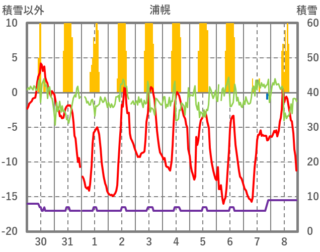 | 日 | 時 | 気温 | 降水 | 風向/風速 | 日照 | 積雪 | 降雪 |