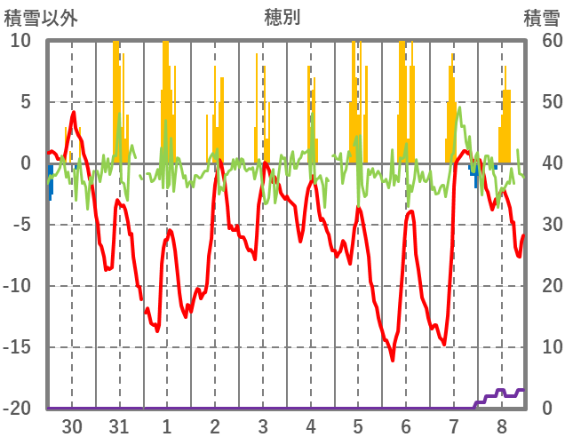| 日 | 時 | 気温 | 降水 | 風向/風速 | 日照 | 積雪 | 降雪 |