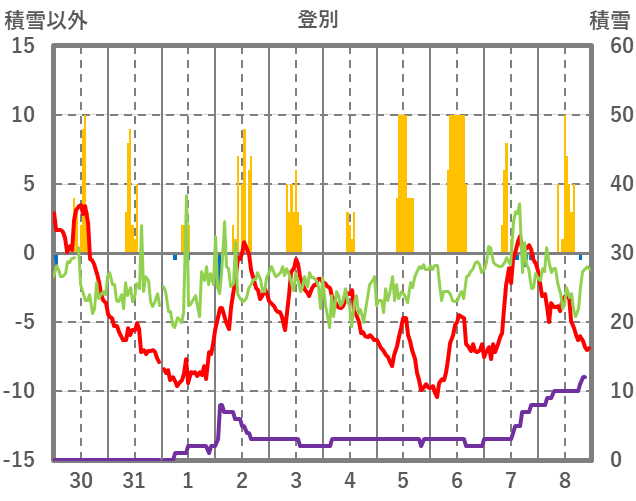 | 日 | 時 | 気温 | 降水 | 風向/風速 | 日照 | 積雪 | 降雪 |