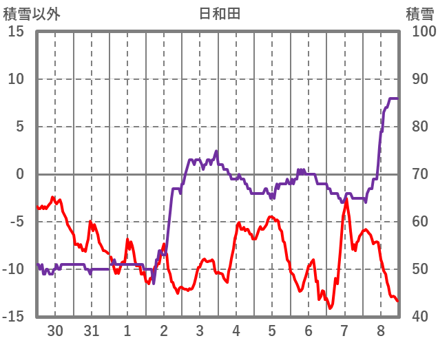 | 日 | 時 | 気温 | 降水 | 風向/風速 | 日照 | 積雪 | 降雪 |