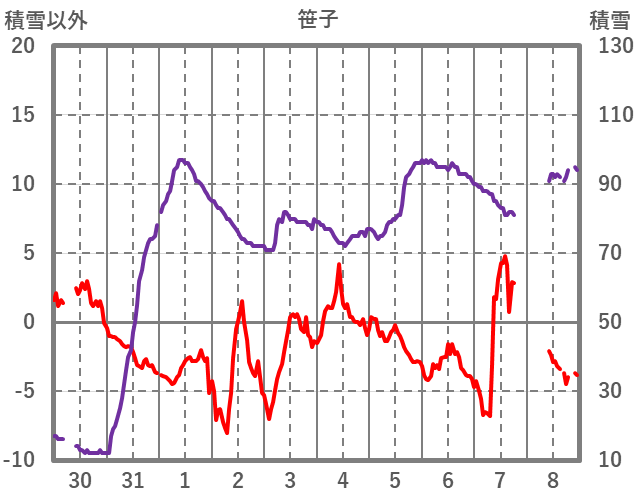 | 日 | 時 | 気温 | 降水 | 風向/風速 | 日照 | 積雪 | 降雪 |