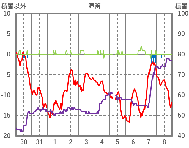 | 日 | 時 | 気温 | 降水 | 風向/風速 | 日照 | 積雪 | 降雪 |