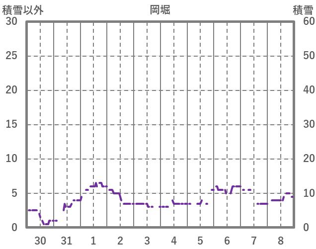 | 日 | 時 | 気温 | 降水 | 風向/風速 | 日照 | 積雪 | 降雪 |