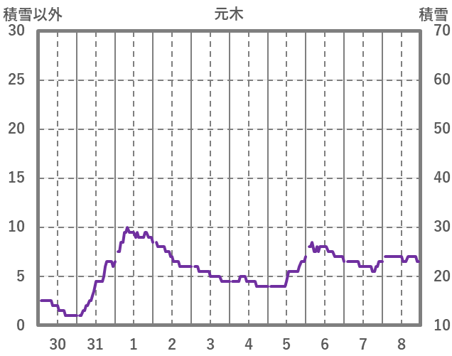 | 日 | 時 | 気温 | 降水 | 風向/風速 | 日照 | 積雪 | 降雪 |