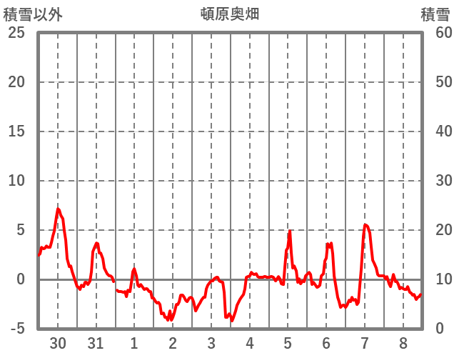 | 日 | 時 | 気温 | 降水 | 風向/風速 | 日照 | 積雪 | 降雪 |
