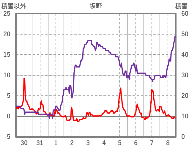 | 日 | 時 | 気温 | 降水 | 風向/風速 | 日照 | 積雪 | 降雪 |
