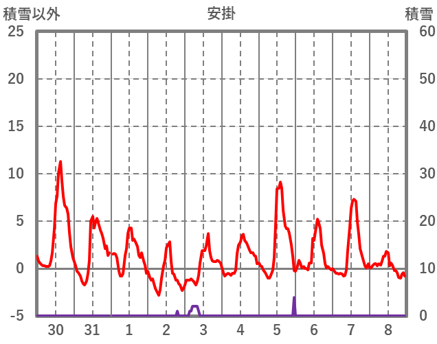 | 日 | 時 | 気温 | 降水 | 風向/風速 | 日照 | 積雪 | 降雪 |