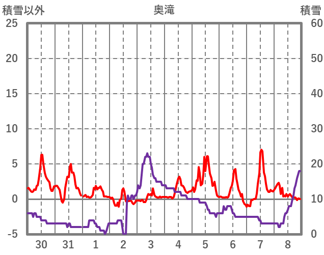 | 日 | 時 | 気温 | 降水 | 風向/風速 | 日照 | 積雪 | 降雪 |
