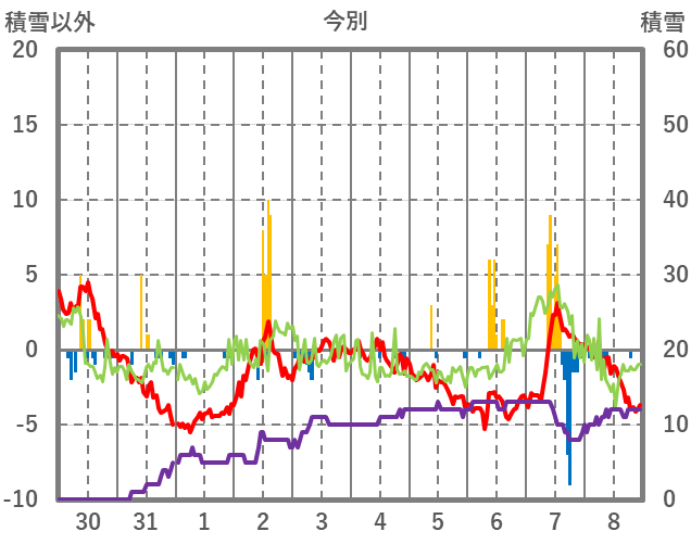 | 日 | 時 | 気温 | 降水 | 風向/風速 | 日照 | 積雪 | 降雪 |