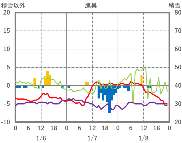 | 日 | 時 | 気温 | 降水 | 風向/風速 | 日照 | 積雪 | 降雪 |