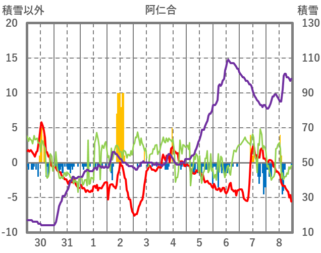 | 日 | 時 | 気温 | 降水 | 風向/風速 | 日照 | 積雪 | 降雪 |