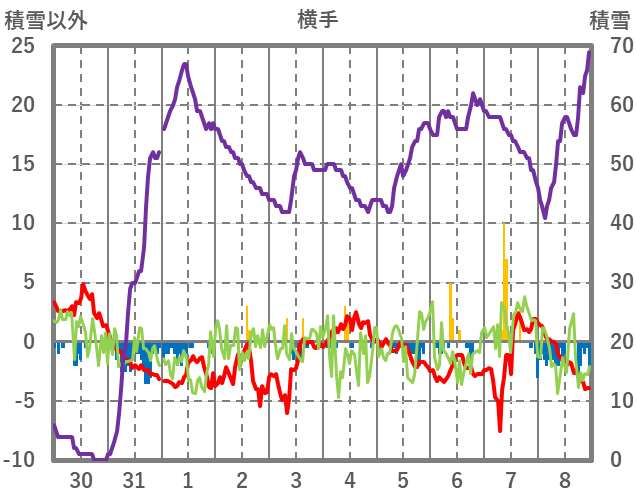 | 日 | 時 | 気温 | 降水 | 風向/風速 | 日照 | 積雪 | 降雪 |