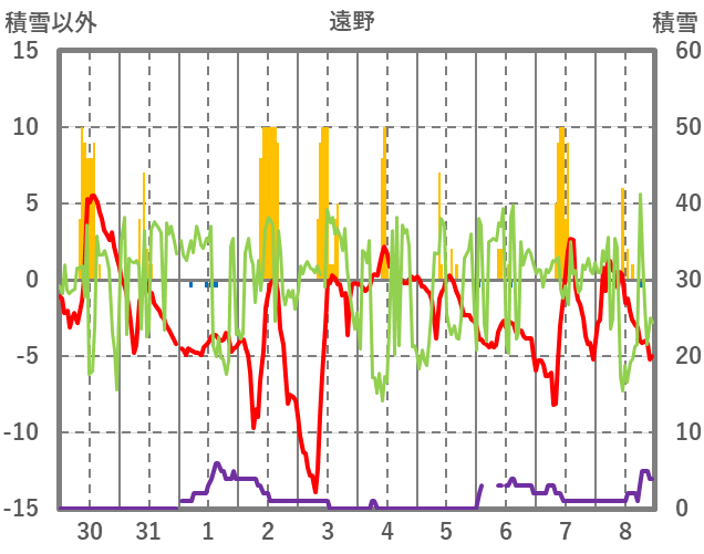 | 日 | 時 | 気温 | 降水 | 風向/風速 | 日照 | 積雪 | 降雪 |