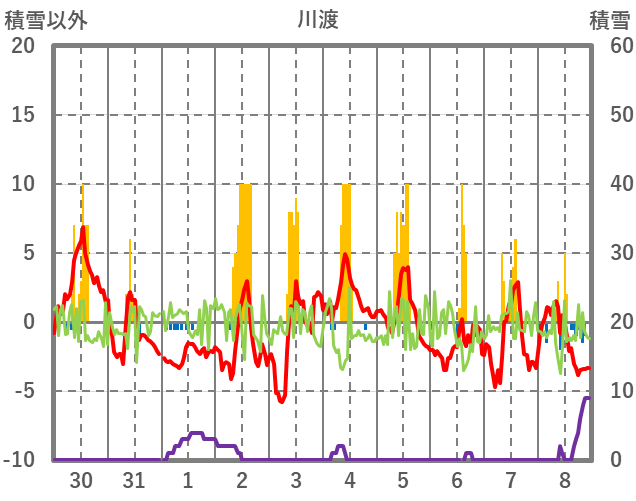| 日 | 時 | 気温 | 降水 | 風向/風速 | 日照 | 積雪 | 降雪 |