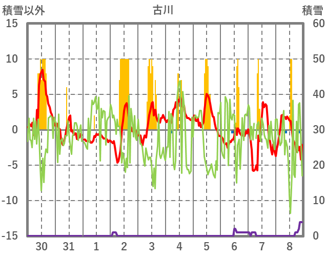 | 日 | 時 | 気温 | 降水 | 風向/風速 | 日照 | 積雪 | 降雪 |