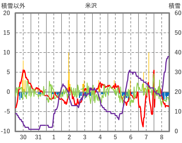 | 日 | 時 | 気温 | 降水 | 風向/風速 | 日照 | 積雪 | 降雪 |