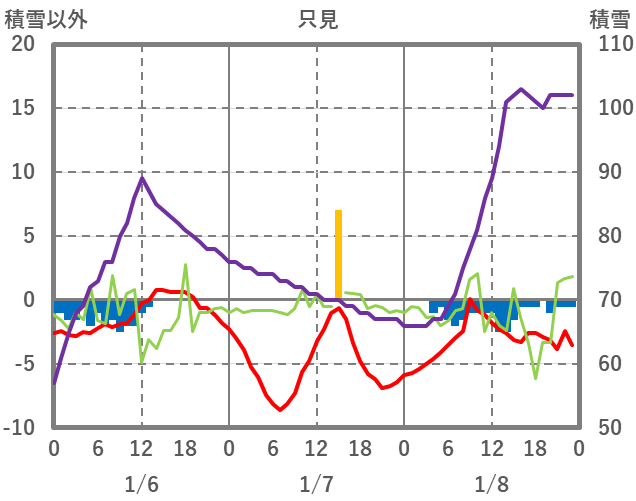 | 日 | 時 | 気温 | 降水 | 風向/風速 | 日照 | 積雪 | 降雪 |