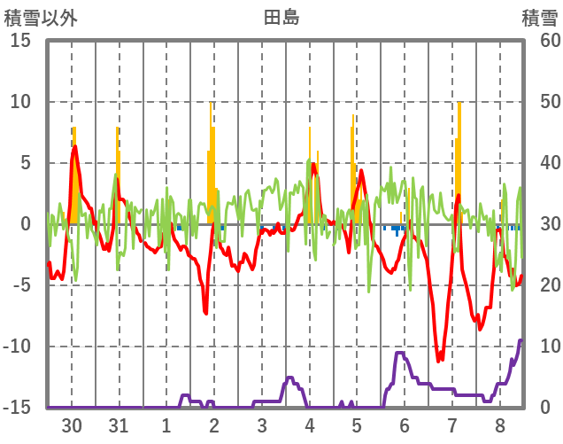 | 日 | 時 | 気温 | 降水 | 風向/風速 | 日照 | 積雪 | 降雪 |