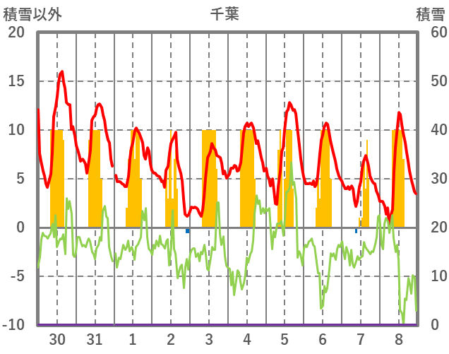 | 日 | 時 | 気温 | 降水 | 風向/風速 | 日照 | 積雪 | 降雪 |