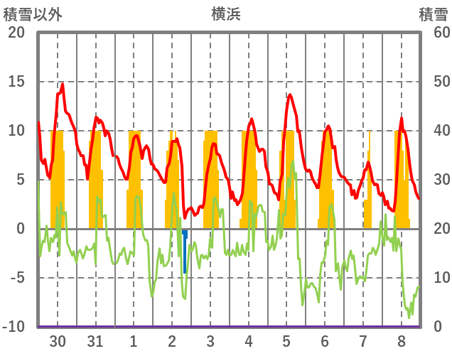 | 日 | 時 | 気温 | 降水 | 風向/風速 | 日照 | 積雪 | 降雪 |