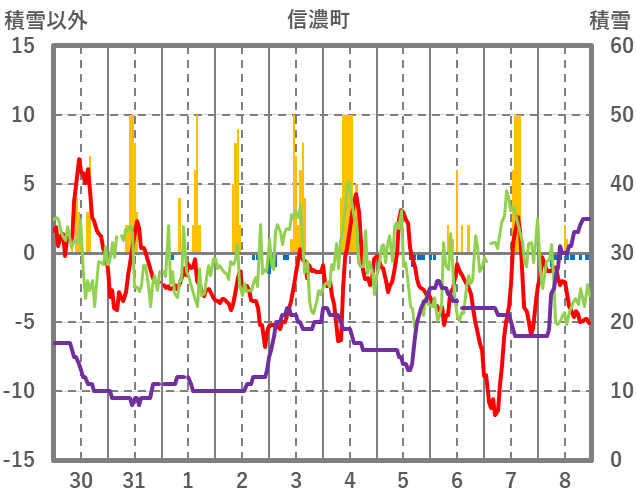 | 日 | 時 | 気温 | 降水 | 風向/風速 | 日照 | 積雪 | 降雪 |