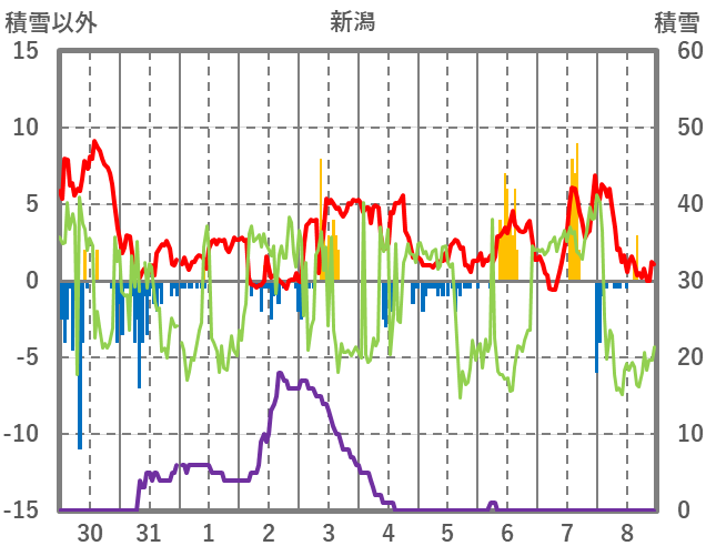 | 日 | 時 | 気温 | 降水 | 風向/風速 | 日照 | 積雪 | 降雪 |