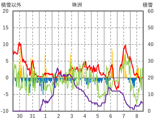 | 日 | 時 | 気温 | 降水 | 風向/風速 | 日照 | 積雪 | 降雪 |