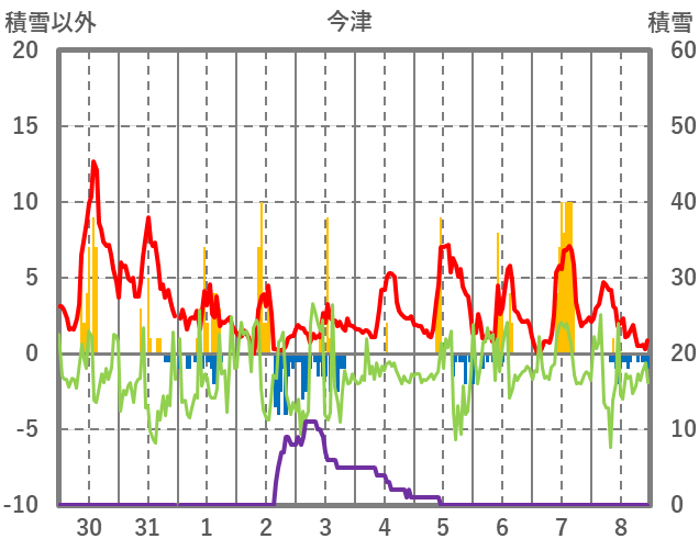 | 日 | 時 | 気温 | 降水 | 風向/風速 | 日照 | 積雪 | 降雪 |