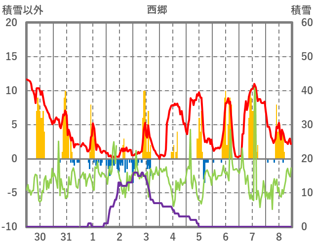 | 日 | 時 | 気温 | 降水 | 風向/風速 | 日照 | 積雪 | 降雪 |