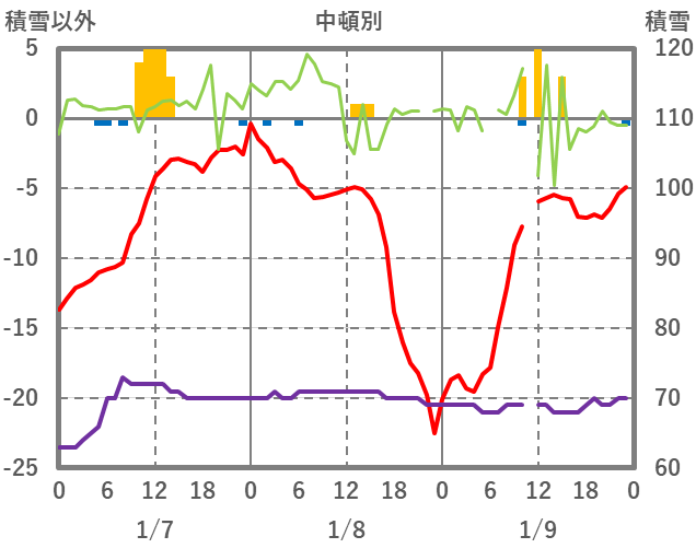 | 日 | 時 | 気温 | 降水 | 風向/風速 | 日照 | 積雪 | 降雪 |