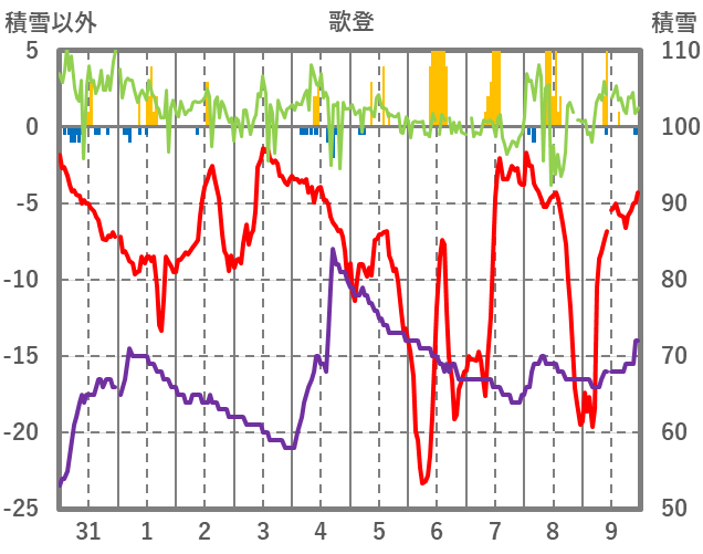 | 日 | 時 | 気温 | 降水 | 風向/風速 | 日照 | 積雪 | 降雪 |