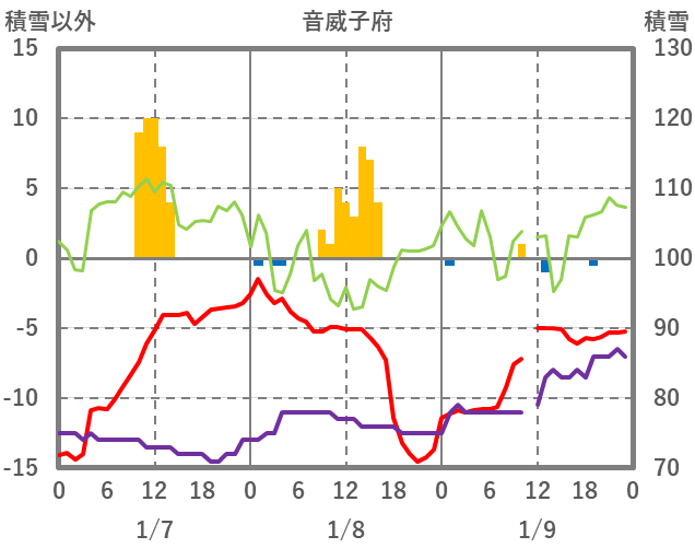 | 日 | 時 | 気温 | 降水 | 風向/風速 | 日照 | 積雪 | 降雪 |
