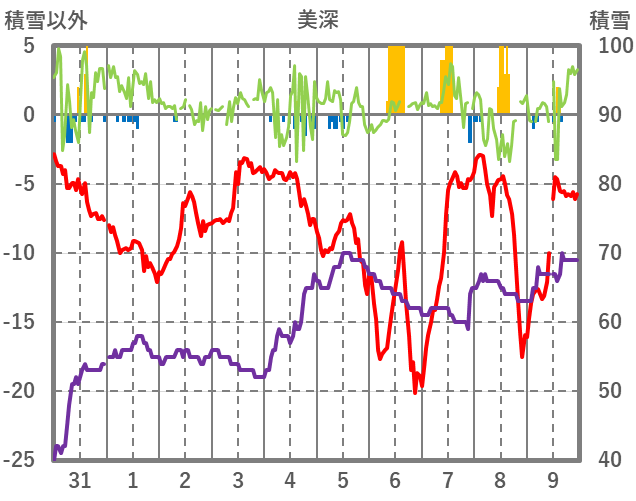 | 日 | 時 | 気温 | 降水 | 風向/風速 | 日照 | 積雪 | 降雪 |