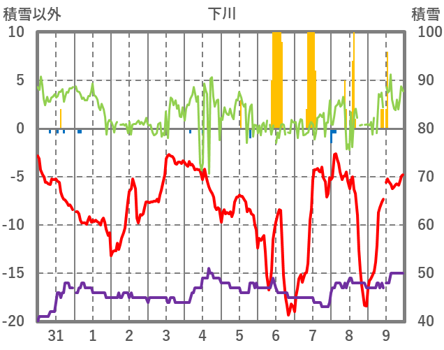 | 日 | 時 | 気温 | 降水 | 風向/風速 | 日照 | 積雪 | 降雪 |