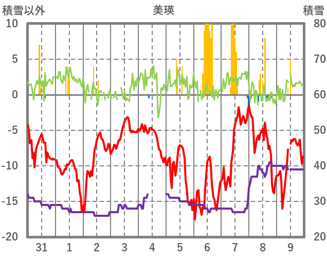 | 日 | 時 | 気温 | 降水 | 風向/風速 | 日照 | 積雪 | 降雪 |
