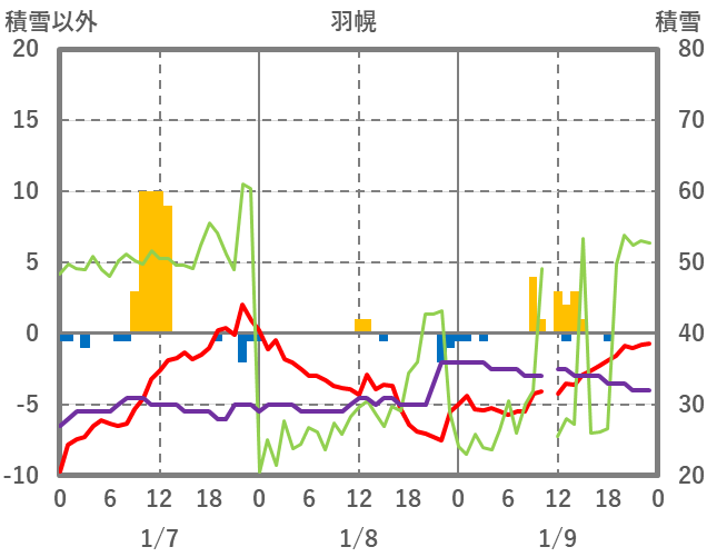 | 日 | 時 | 気温 | 降水 | 風向/風速 | 日照 | 積雪 | 降雪 |
