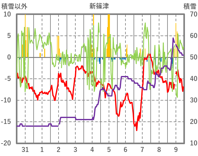 | 日 | 時 | 気温 | 降水 | 風向/風速 | 日照 | 積雪 | 降雪 |