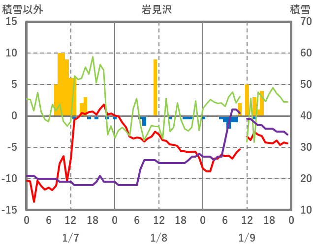 | 日 | 時 | 気温 | 降水 | 風向/風速 | 日照 | 積雪 | 降雪 |