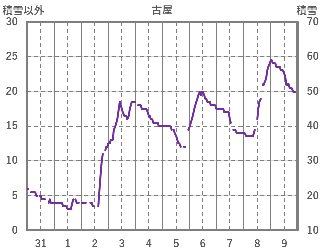 | 日 | 時 | 気温 | 降水 | 風向/風速 | 日照 | 積雪 | 降雪 |