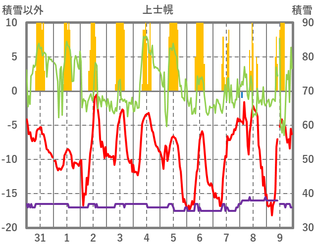 | 日 | 時 | 気温 | 降水 | 風向/風速 | 日照 | 積雪 | 降雪 |