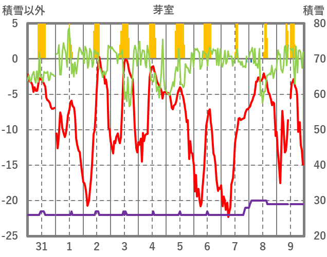 | 日 | 時 | 気温 | 降水 | 風向/風速 | 日照 | 積雪 | 降雪 |