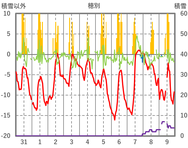 | 日 | 時 | 気温 | 降水 | 風向/風速 | 日照 | 積雪 | 降雪 |