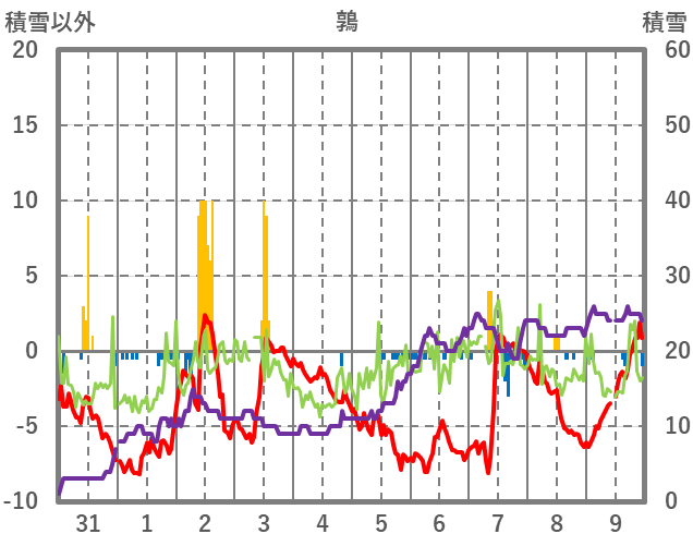 | 日 | 時 | 気温 | 降水 | 風向/風速 | 日照 | 積雪 | 降雪 |