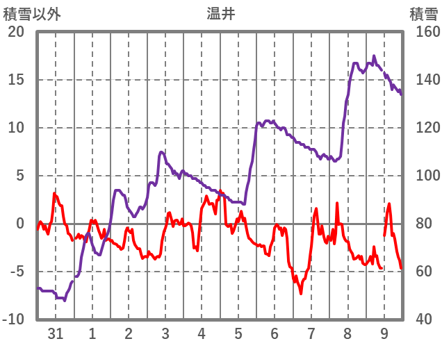 | 日 | 時 | 気温 | 降水 | 風向/風速 | 日照 | 積雪 | 降雪 |