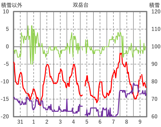 | 日 | 時 | 気温 | 降水 | 風向/風速 | 日照 | 積雪 | 降雪 |