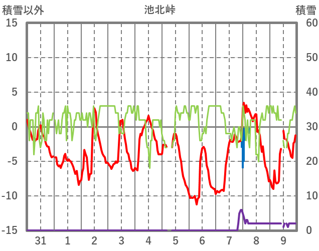 | 日 | 時 | 気温 | 降水 | 風向/風速 | 日照 | 積雪 | 降雪 |