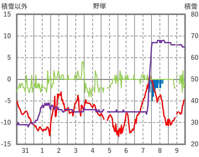 | 日 | 時 | 気温 | 降水 | 風向/風速 | 日照 | 積雪 | 降雪 |