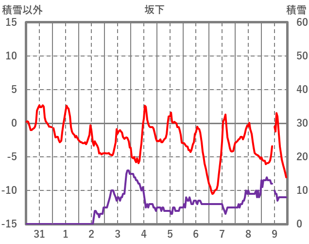 | 日 | 時 | 気温 | 降水 | 風向/風速 | 日照 | 積雪 | 降雪 |