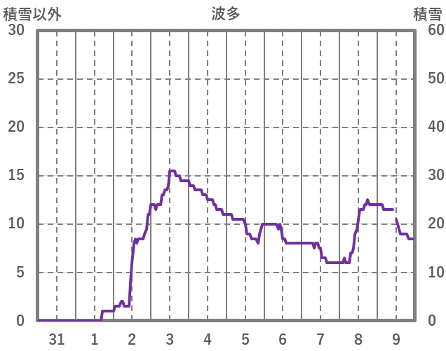| 日 | 時 | 気温 | 降水 | 風向/風速 | 日照 | 積雪 | 降雪 |