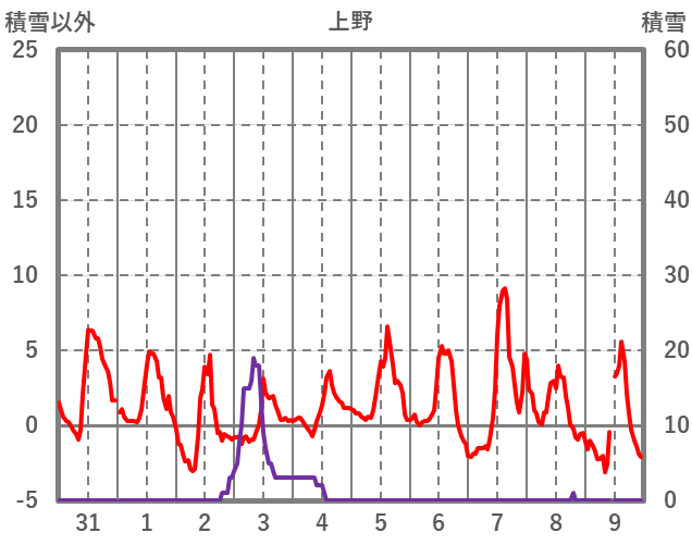 | 日 | 時 | 気温 | 降水 | 風向/風速 | 日照 | 積雪 | 降雪 |